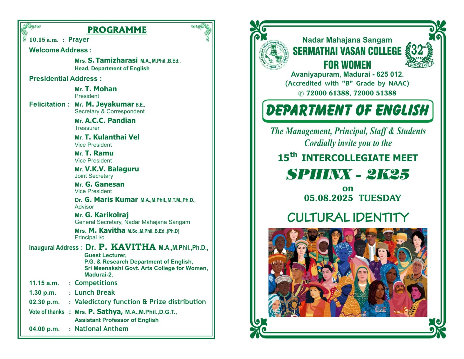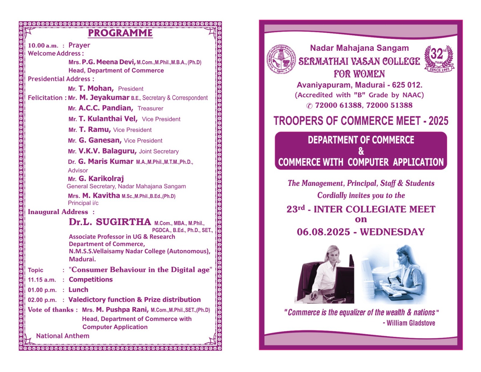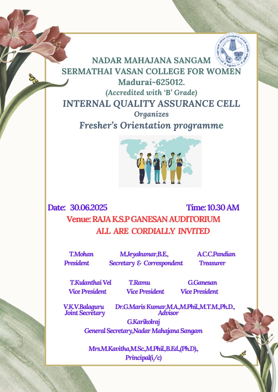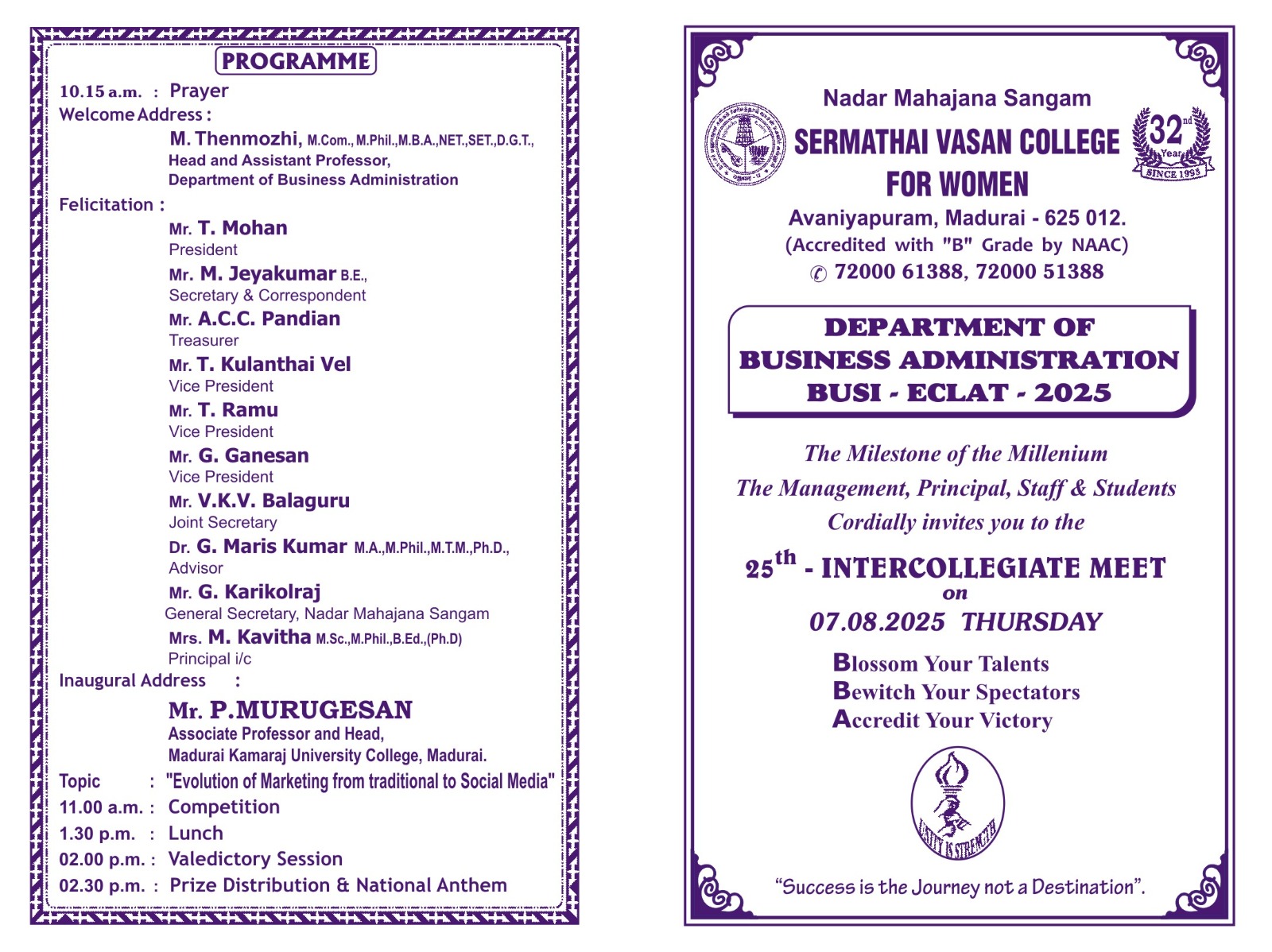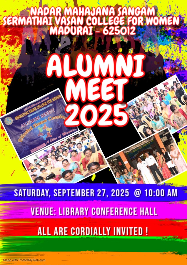 NMS Sermathai Vasan College is secular in its outlook and welcomes students from all castes, religions, creed and languages to be a part of the Nadar mahajana sangam family.